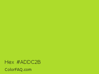 Hex #addc2b Color is a normal lime color and the nearest color is Inch Worm #b0e313. Hex code #addc2b and RGB value is rgb(173,220,43). In RGB color space, this color is composed of 68% red, 86% green, 17% blue, In CMYK color space, this color is composed of 21% cyan, 0% magenta, 80% yellow , 14% black , In HSL color space, this color has a hue angle of 76° , 72% saturation and 52% lightness.