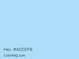 Hex #adddf8 Color is a very light blue color and the nearest color is Sail #b8e0f9. Hex code #adddf8 and RGB value is rgb(173,221,248). In RGB color space, this color is composed of 68% red, 87% green, 97% blue, In CMYK color space, this color is composed of 30% cyan, 11% magenta, 0% yellow , 3% black , In HSL color space, this color has a hue angle of 202° , 84% saturation and 83% lightness.