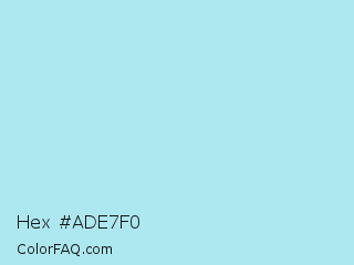 Hex #ade7f0 Color is a very light cyan color and the nearest color is Blizzard Blue #ace5ee. Hex code #ade7f0 and RGB value is rgb(173,231,240). In RGB color space, this color is composed of 68% red, 91% green, 94% blue, In CMYK color space, this color is composed of 28% cyan, 4% magenta, 0% yellow , 6% black , In HSL color space, this color has a hue angle of 188° , 69% saturation and 81% lightness.