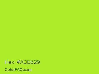 Hex #adeb29 Color is a normal lime color and the nearest color is Green Lizard #a7f432. Hex code #adeb29 and RGB value is rgb(173,235,41). In RGB color space, this color is composed of 68% red, 92% green, 16% blue, In CMYK color space, this color is composed of 26% cyan, 0% magenta, 83% yellow , 8% black , In HSL color space, this color has a hue angle of 79° , 83% saturation and 54% lightness.