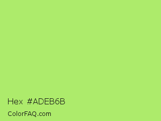 Hex #adeb6b Color is a light green color and the nearest color is Inchworm #b2ec5d. Hex code #adeb6b and RGB value is rgb(173,235,107). In RGB color space, this color is composed of 68% red, 92% green, 42% blue, In CMYK color space, this color is composed of 26% cyan, 0% magenta, 54% yellow , 8% black , In HSL color space, this color has a hue angle of 89° , 76% saturation and 67% lightness.