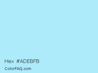 Hex #adebfb Color is a very light cyan color and the nearest color is Fresh Air #a6e7ff. Hex code #adebfb and RGB value is rgb(173,235,251). In RGB color space, this color is composed of 68% red, 92% green, 98% blue, In CMYK color space, this color is composed of 31% cyan, 6% magenta, 0% yellow , 2% black , In HSL color space, this color has a hue angle of 192° , 91% saturation and 83% lightness.