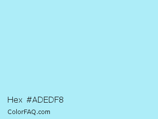 Hex #adedf8 Color is a very light cyan color and the nearest color is Pale Turquoise #afeeee. Hex code #adedf8 and RGB value is rgb(173,237,248). In RGB color space, this color is composed of 68% red, 93% green, 97% blue, In CMYK color space, this color is composed of 30% cyan, 4% magenta, 0% yellow , 3% black , In HSL color space, this color has a hue angle of 189° , 84% saturation and 83% lightness.