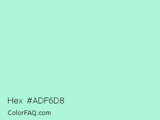 Hex #adf6d8 Color is a very light green color and the nearest color is Magic Mint #aaf0d1. Hex code #adf6d8 and RGB value is rgb(173,246,216). In RGB color space, this color is composed of 68% red, 96% green, 85% blue, In CMYK color space, this color is composed of 30% cyan, 0% magenta, 12% yellow , 4% black , In HSL color space, this color has a hue angle of 155° , 80% saturation and 82% lightness.