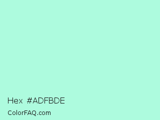 Hex #adfbde Color is a very light green color and the nearest color is Ice Cold #b1f4e7. Hex code #adfbde and RGB value is rgb(173,251,222). In RGB color space, this color is composed of 68% red, 98% green, 87% blue, In CMYK color space, this color is composed of 31% cyan, 0% magenta, 12% yellow , 2% black , In HSL color space, this color has a hue angle of 158° , 91% saturation and 83% lightness.