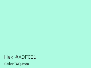 Hex #adfce1 Color is a very light green color and the nearest color is Ice Cold #b1f4e7. Hex code #adfce1 and RGB value is rgb(173,252,225). In RGB color space, this color is composed of 68% red, 99% green, 88% blue, In CMYK color space, this color is composed of 31% cyan, 0% magenta, 11% yellow , 1% black , In HSL color space, this color has a hue angle of 159° , 93% saturation and 83% lightness.