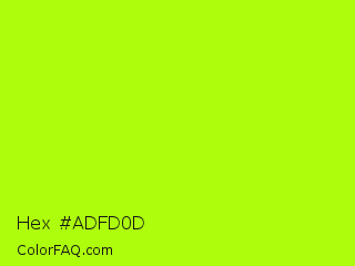 Hex #adfd0d Color is a normal green color and the nearest color is Spring Bud #a7fc00. Hex code #adfd0d and RGB value is rgb(173,253,13). In RGB color space, this color is composed of 68% red, 99% green, 5% blue, In CMYK color space, this color is composed of 32% cyan, 0% magenta, 95% yellow , 1% black , In HSL color space, this color has a hue angle of 80° , 98% saturation and 52% lightness.