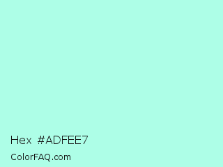 Hex #adfee7 Color is a very light green color and the nearest color is Ice Cold #b1f4e7. Hex code #adfee7 and RGB value is rgb(173,254,231). In RGB color space, this color is composed of 68% red, 100% green, 91% blue, In CMYK color space, this color is composed of 32% cyan, 0% magenta, 9% yellow , 0% black , In HSL color space, this color has a hue angle of 163° , 98% saturation and 84% lightness.