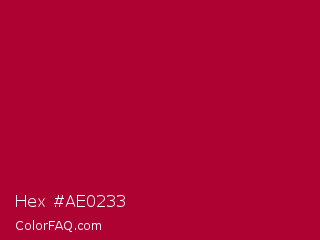 Hex #ae0233 Color is a normal rose color and the nearest color is Shiraz #b20931. Hex code #ae0233 and RGB value is rgb(174,2,51). In RGB color space, this color is composed of 68% red, 1% green, 20% blue, In CMYK color space, this color is composed of 0% cyan, 99% magenta, 71% yellow , 32% black , In HSL color space, this color has a hue angle of 343° , 98% saturation and 35% lightness.