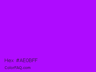 Hex #ae0bff Color is a normal purple color and the nearest color is Vivid Violet #9f00ff. Hex code #ae0bff and RGB value is rgb(174,11,255). In RGB color space, this color is composed of 68% red, 4% green, 100% blue, In CMYK color space, this color is composed of 32% cyan, 96% magenta, 0% yellow , 0% black , In HSL color space, this color has a hue angle of 280° , 100% saturation and 52% lightness.