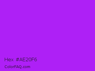 Hex #ae20f6 Color is a normal purple color and the nearest color is Veronica #a020f0. Hex code #ae20f6 and RGB value is rgb(174,32,246). In RGB color space, this color is composed of 68% red, 13% green, 96% blue, In CMYK color space, this color is composed of 29% cyan, 87% magenta, 0% yellow , 4% black , In HSL color space, this color has a hue angle of 280° , 92% saturation and 55% lightness.