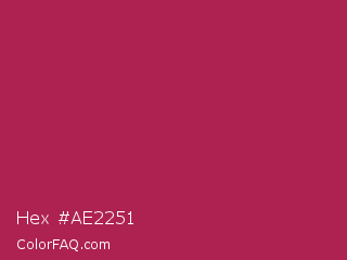 Hex #ae2251 Color is a normal rose color and the nearest color is Amaranth Purple #ab274f. Hex code #ae2251 and RGB value is rgb(174,34,81). In RGB color space, this color is composed of 68% red, 13% green, 32% blue, In CMYK color space, this color is composed of 0% cyan, 80% magenta, 53% yellow , 32% black , In HSL color space, this color has a hue angle of 340° , 67% saturation and 41% lightness.
