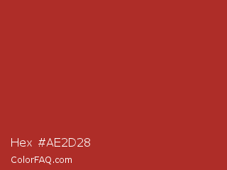 Hex #ae2d28 Color is a normal red color and the nearest color is Tall Poppy #b32d29. Hex code #ae2d28 and RGB value is rgb(174,45,40). In RGB color space, this color is composed of 68% red, 18% green, 16% blue, In CMYK color space, this color is composed of 0% cyan, 74% magenta, 77% yellow , 32% black , In HSL color space, this color has a hue angle of 2° , 63% saturation and 42% lightness.
