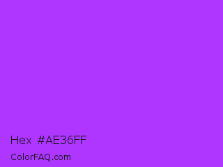 Hex #ae36ff Color is a light purple color and the nearest color is Veronica #a020f0. Hex code #ae36ff and RGB value is rgb(174,54,255). In RGB color space, this color is composed of 68% red, 21% green, 100% blue, In CMYK color space, this color is composed of 32% cyan, 79% magenta, 0% yellow , 0% black , In HSL color space, this color has a hue angle of 276° , 100% saturation and 61% lightness.