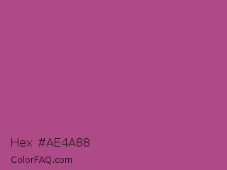 Hex #ae4a88 Color is a normal magenta color and the nearest color is Mystic Maroon #ad4379. Hex code #ae4a88 and RGB value is rgb(174,74,136). In RGB color space, this color is composed of 68% red, 29% green, 53% blue, In CMYK color space, this color is composed of 0% cyan, 57% magenta, 22% yellow , 32% black , In HSL color space, this color has a hue angle of 323° , 40% saturation and 49% lightness.