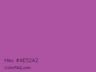 Hex #ae52a2 Color is a normal magenta color and the nearest color is Purpureus #9a4eae. Hex code #ae52a2 and RGB value is rgb(174,82,162). In RGB color space, this color is composed of 68% red, 32% green, 64% blue, In CMYK color space, this color is composed of 0% cyan, 53% magenta, 7% yellow , 32% black , In HSL color space, this color has a hue angle of 308° , 36% saturation and 50% lightness.