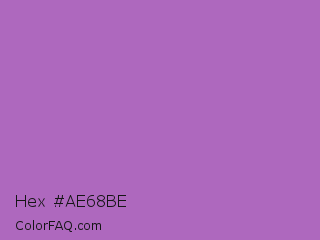 Hex #ae68be Color is a normal purple color and the nearest color is Rich Lavender #a76bcf. Hex code #ae68be and RGB value is rgb(174,104,190). In RGB color space, this color is composed of 68% red, 41% green, 75% blue, In CMYK color space, this color is composed of 8% cyan, 45% magenta, 0% yellow , 25% black , In HSL color space, this color has a hue angle of 289° , 40% saturation and 58% lightness.