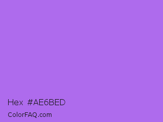 Hex #ae6bed Color is a light purple color and the nearest color is Lavender #b57edc. Hex code #ae6bed and RGB value is rgb(174,107,237). In RGB color space, this color is composed of 68% red, 42% green, 93% blue, In CMYK color space, this color is composed of 27% cyan, 55% magenta, 0% yellow , 7% black , In HSL color space, this color has a hue angle of 271° , 78% saturation and 67% lightness.