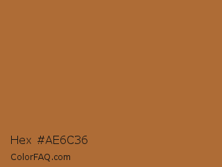 Hex #ae6c36 Color is a normal orange color and the nearest color is Copper #b87333. Hex code #ae6c36 and RGB value is rgb(174,108,54). In RGB color space, this color is composed of 68% red, 42% green, 21% blue, In CMYK color space, this color is composed of 0% cyan, 38% magenta, 69% yellow , 32% black , In HSL color space, this color has a hue angle of 27° , 53% saturation and 45% lightness.