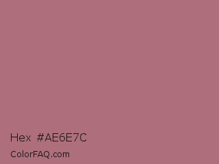 Hex #ae6e7c Color is a normal red color and the nearest color is Turkish Rose #b57281. Hex code #ae6e7c and RGB value is rgb(174,110,124). In RGB color space, this color is composed of 68% red, 43% green, 49% blue, In CMYK color space, this color is composed of 0% cyan, 37% magenta, 29% yellow , 32% black , In HSL color space, this color has a hue angle of 347° , 28% saturation and 56% lightness.
