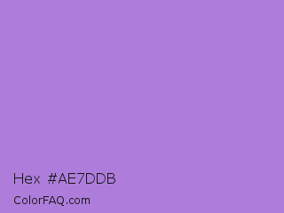 Hex #ae7ddb Color is a light purple color and the nearest color is Lavender #b57edc. Hex code #ae7ddb and RGB value is rgb(174,125,219). In RGB color space, this color is composed of 68% red, 49% green, 86% blue, In CMYK color space, this color is composed of 21% cyan, 43% magenta, 0% yellow , 14% black , In HSL color space, this color has a hue angle of 271° , 57% saturation and 67% lightness.