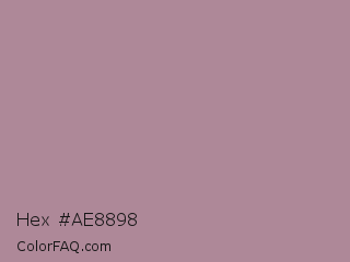 Hex #ae8898 Color is a light rose color and the nearest color is English Lavender #b48395. Hex code #ae8898 and RGB value is rgb(174,136,152). In RGB color space, this color is composed of 68% red, 53% green, 60% blue, In CMYK color space, this color is composed of 0% cyan, 22% magenta, 13% yellow , 32% black , In HSL color space, this color has a hue angle of 335° , 19% saturation and 61% lightness.