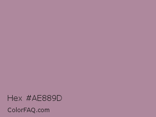 Hex #ae889d Color is a light magenta color and the nearest color is Bouquet #ae809e. Hex code #ae889d and RGB value is rgb(174,136,157). In RGB color space, this color is composed of 68% red, 53% green, 62% blue, In CMYK color space, this color is composed of 0% cyan, 22% magenta, 10% yellow , 32% black , In HSL color space, this color has a hue angle of 327° , 19% saturation and 61% lightness.