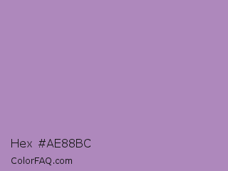 Hex #ae88bc Color is a light purple color and the nearest color is African Violet #b284be. Hex code #ae88bc and RGB value is rgb(174,136,188). In RGB color space, this color is composed of 68% red, 53% green, 74% blue, In CMYK color space, this color is composed of 7% cyan, 28% magenta, 0% yellow , 26% black , In HSL color space, this color has a hue angle of 284° , 28% saturation and 64% lightness.