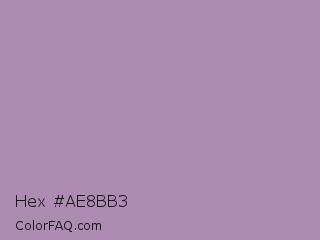 Hex #ae8bb3 Color is a light magenta color and the nearest color is Glossy Grape #ab92b3. Hex code #ae8bb3 and RGB value is rgb(174,139,179). In RGB color space, this color is composed of 68% red, 55% green, 70% blue, In CMYK color space, this color is composed of 3% cyan, 22% magenta, 0% yellow , 30% black , In HSL color space, this color has a hue angle of 293° , 21% saturation and 62% lightness.