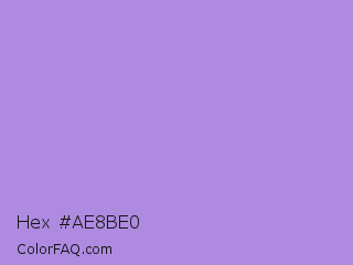 Hex #ae8be0 Color is a light violet color and the nearest color is Lavender #b57edc. Hex code #ae8be0 and RGB value is rgb(174,139,224). In RGB color space, this color is composed of 68% red, 55% green, 88% blue, In CMYK color space, this color is composed of 22% cyan, 38% magenta, 0% yellow , 12% black , In HSL color space, this color has a hue angle of 265° , 58% saturation and 71% lightness.
