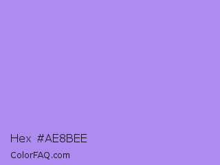 Hex #ae8bee Color is a light violet color and the nearest color is Dull Lavender #a899e6. Hex code #ae8bee and RGB value is rgb(174,139,238). In RGB color space, this color is composed of 68% red, 55% green, 93% blue, In CMYK color space, this color is composed of 27% cyan, 42% magenta, 0% yellow , 7% black , In HSL color space, this color has a hue angle of 261° , 74% saturation and 74% lightness.