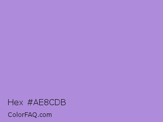 Hex #ae8cdb Color is a light violet color and the nearest color is East Side #ac91ce. Hex code #ae8cdb and RGB value is rgb(174,140,219). In RGB color space, this color is composed of 68% red, 55% green, 86% blue, In CMYK color space, this color is composed of 21% cyan, 36% magenta, 0% yellow , 14% black , In HSL color space, this color has a hue angle of 266° , 52% saturation and 70% lightness.
