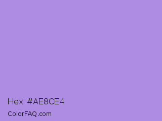 Hex #ae8ce4 Color is a light violet color and the nearest color is Dull Lavender #a899e6. Hex code #ae8ce4 and RGB value is rgb(174,140,228). In RGB color space, this color is composed of 68% red, 55% green, 89% blue, In CMYK color space, this color is composed of 24% cyan, 39% magenta, 0% yellow , 11% black , In HSL color space, this color has a hue angle of 263° , 62% saturation and 72% lightness.