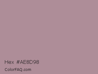 Hex #ae8d98 Color is a light rose color and the nearest color is English Lavender #b48395. Hex code #ae8d98 and RGB value is rgb(174,141,152). In RGB color space, this color is composed of 68% red, 55% green, 60% blue, In CMYK color space, this color is composed of 0% cyan, 19% magenta, 13% yellow , 32% black , In HSL color space, this color has a hue angle of 340° , 17% saturation and 62% lightness.
