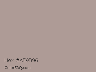 Hex #ae9b96 Color is a light red color and the nearest color is Del Rio #b09a95. Hex code #ae9b96 and RGB value is rgb(174,155,150). In RGB color space, this color is composed of 68% red, 61% green, 59% blue, In CMYK color space, this color is composed of 0% cyan, 11% magenta, 14% yellow , 32% black , In HSL color space, this color has a hue angle of 13° , 13% saturation and 64% lightness.