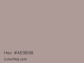 Hex #ae9b98 Color is a light red color and the nearest color is Del Rio #b09a95. Hex code #ae9b98 and RGB value is rgb(174,155,152). In RGB color space, this color is composed of 68% red, 61% green, 60% blue, In CMYK color space, this color is composed of 0% cyan, 11% magenta, 13% yellow , 32% black , In HSL color space, this color has a hue angle of 8° , 12% saturation and 64% lightness.