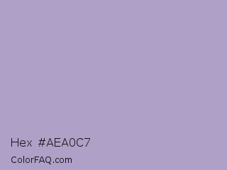 Hex #aea0c7 Color is a light violet color and the nearest color is Logan #aaa9cd. Hex code #aea0c7 and RGB value is rgb(174,160,199). In RGB color space, this color is composed of 68% red, 63% green, 78% blue, In CMYK color space, this color is composed of 13% cyan, 20% magenta, 0% yellow , 22% black , In HSL color space, this color has a hue angle of 262° , 26% saturation and 70% lightness.