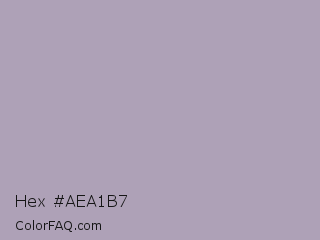 Hex #aea1b7 Color is a light purple color and the nearest color is Pastel Purple #b39eb5. Hex code #aea1b7 and RGB value is rgb(174,161,183). In RGB color space, this color is composed of 68% red, 63% green, 72% blue, In CMYK color space, this color is composed of 5% cyan, 12% magenta, 0% yellow , 28% black , In HSL color space, this color has a hue angle of 275° , 13% saturation and 67% lightness.