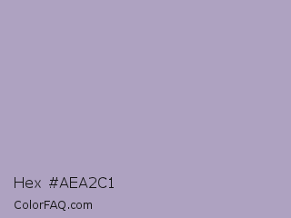 Hex #aea2c1 Color is a light violet color and the nearest color is Pastel Purple #b39eb5. Hex code #aea2c1 and RGB value is rgb(174,162,193). In RGB color space, this color is composed of 68% red, 64% green, 76% blue, In CMYK color space, this color is composed of 10% cyan, 16% magenta, 0% yellow , 24% black , In HSL color space, this color has a hue angle of 263° , 20% saturation and 70% lightness.