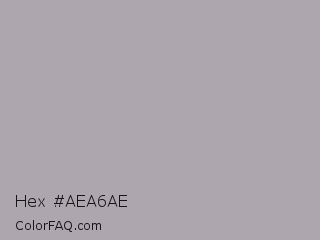 Hex #aea6ae Color is a light magenta color and the nearest color is Shady Lady #aaa5a9. Hex code #aea6ae and RGB value is rgb(174,166,174). In RGB color space, this color is composed of 68% red, 65% green, 68% blue, In CMYK color space, this color is composed of 0% cyan, 5% magenta, 0% yellow , 32% black , In HSL color space, this color has a hue angle of 300° , 5% saturation and 67% lightness.