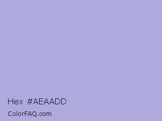 Hex #aeaadd Color is a light indigo color and the nearest color is Maximum Blue Purple #acace6. Hex code #aeaadd and RGB value is rgb(174,170,221). In RGB color space, this color is composed of 68% red, 67% green, 87% blue, In CMYK color space, this color is composed of 21% cyan, 23% magenta, 0% yellow , 13% black , In HSL color space, this color has a hue angle of 245° , 43% saturation and 77% lightness.