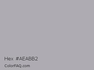 Hex #aeabb2 Color is a light violet color and the nearest color is Silver Chalice #acacac. Hex code #aeabb2 and RGB value is rgb(174,171,178). In RGB color space, this color is composed of 68% red, 67% green, 70% blue, In CMYK color space, this color is composed of 2% cyan, 4% magenta, 0% yellow , 30% black , In HSL color space, this color has a hue angle of 266° , 4% saturation and 68% lightness.
