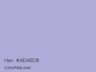 Hex #aeabd8 Color is a light indigo color and the nearest color is Cold Purple #aba0d9. Hex code #aeabd8 and RGB value is rgb(174,171,216). In RGB color space, this color is composed of 68% red, 67% green, 85% blue, In CMYK color space, this color is composed of 19% cyan, 21% magenta, 0% yellow , 15% black , In HSL color space, this color has a hue angle of 244° , 37% saturation and 76% lightness.