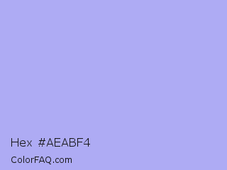 Hex #aeabf4 Color is a very light indigo color and the nearest color is Maximum Blue Purple #acace6. Hex code #aeabf4 and RGB value is rgb(174,171,244). In RGB color space, this color is composed of 68% red, 67% green, 96% blue, In CMYK color space, this color is composed of 29% cyan, 30% magenta, 0% yellow , 4% black , In HSL color space, this color has a hue angle of 242° , 77% saturation and 81% lightness.