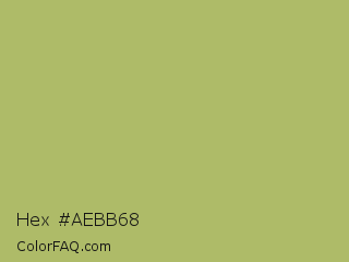 Hex #aebb68 Color is a normal yellow color and the nearest color is Middle Green Yellow #acbf60. Hex code #aebb68 and RGB value is rgb(174,187,104). In RGB color space, this color is composed of 68% red, 73% green, 41% blue, In CMYK color space, this color is composed of 7% cyan, 0% magenta, 44% yellow , 27% black , In HSL color space, this color has a hue angle of 69° , 38% saturation and 57% lightness.