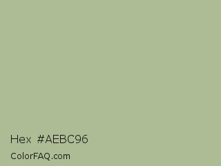 Hex #aebc96 Color is a light green color and the nearest color is Laurel Green #a9ba9d. Hex code #aebc96 and RGB value is rgb(174,188,150). In RGB color space, this color is composed of 68% red, 74% green, 59% blue, In CMYK color space, this color is composed of 7% cyan, 0% magenta, 20% yellow , 26% black , In HSL color space, this color has a hue angle of 82° , 22% saturation and 66% lightness.