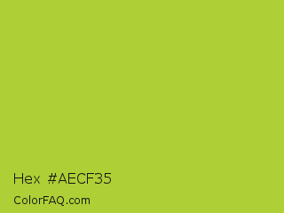 Hex #aecf35 Color is a normal lime color and the nearest color is Android Green #a4c639. Hex code #aecf35 and RGB value is rgb(174,207,53). In RGB color space, this color is composed of 68% red, 81% green, 21% blue, In CMYK color space, this color is composed of 16% cyan, 0% magenta, 74% yellow , 19% black , In HSL color space, this color has a hue angle of 73° , 62% saturation and 51% lightness.