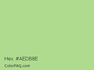 Hex #aedb8e Color is a light green color and the nearest color is Feijoa #9fdd8c. Hex code #aedb8e and RGB value is rgb(174,219,142). In RGB color space, this color is composed of 68% red, 86% green, 56% blue, In CMYK color space, this color is composed of 21% cyan, 0% magenta, 35% yellow , 14% black , In HSL color space, this color has a hue angle of 95° , 52% saturation and 71% lightness.
