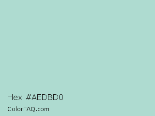 Hex #aedbd0 Color is a light cyan color and the nearest color is Jet Stream #b5d2ce. Hex code #aedbd0 and RGB value is rgb(174,219,208). In RGB color space, this color is composed of 68% red, 86% green, 82% blue, In CMYK color space, this color is composed of 21% cyan, 0% magenta, 5% yellow , 14% black , In HSL color space, this color has a hue angle of 165° , 38% saturation and 77% lightness.