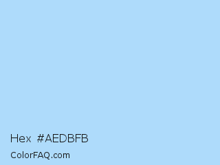 Hex #aedbfb Color is a very light blue color and the nearest color is Sail #b8e0f9. Hex code #aedbfb and RGB value is rgb(174,219,251). In RGB color space, this color is composed of 68% red, 86% green, 98% blue, In CMYK color space, this color is composed of 31% cyan, 13% magenta, 0% yellow , 2% black , In HSL color space, this color has a hue angle of 205° , 91% saturation and 83% lightness.